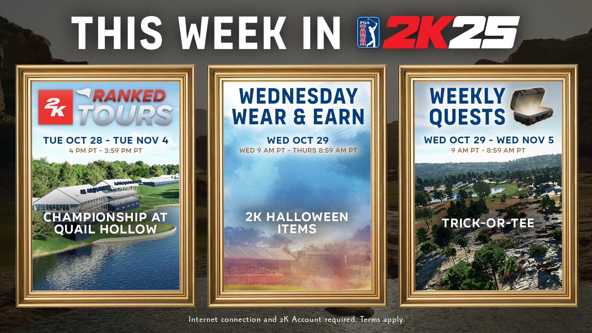 On Wear & Earn Wednesday, you've got 24 hours to rep a specific item type from the featured brand in the PGA TOUR Superstore. Complete the following objectives wearing apparel from this week’s featured brand between 9 AM PT Wednesday and 8:59 AM PT Thursday, to earn 2x Lvl↑ Tokens, 1 x Shape Fitting, and 450 MyPLAYER XP: • Complete 5 holes • Make 3 Birdies • Play 1 round in Ranked Matchmaking This week's featured brand is: 2K Halloween Items. Find it in the Featured section of the PGA TOUR Superstore, in-game.