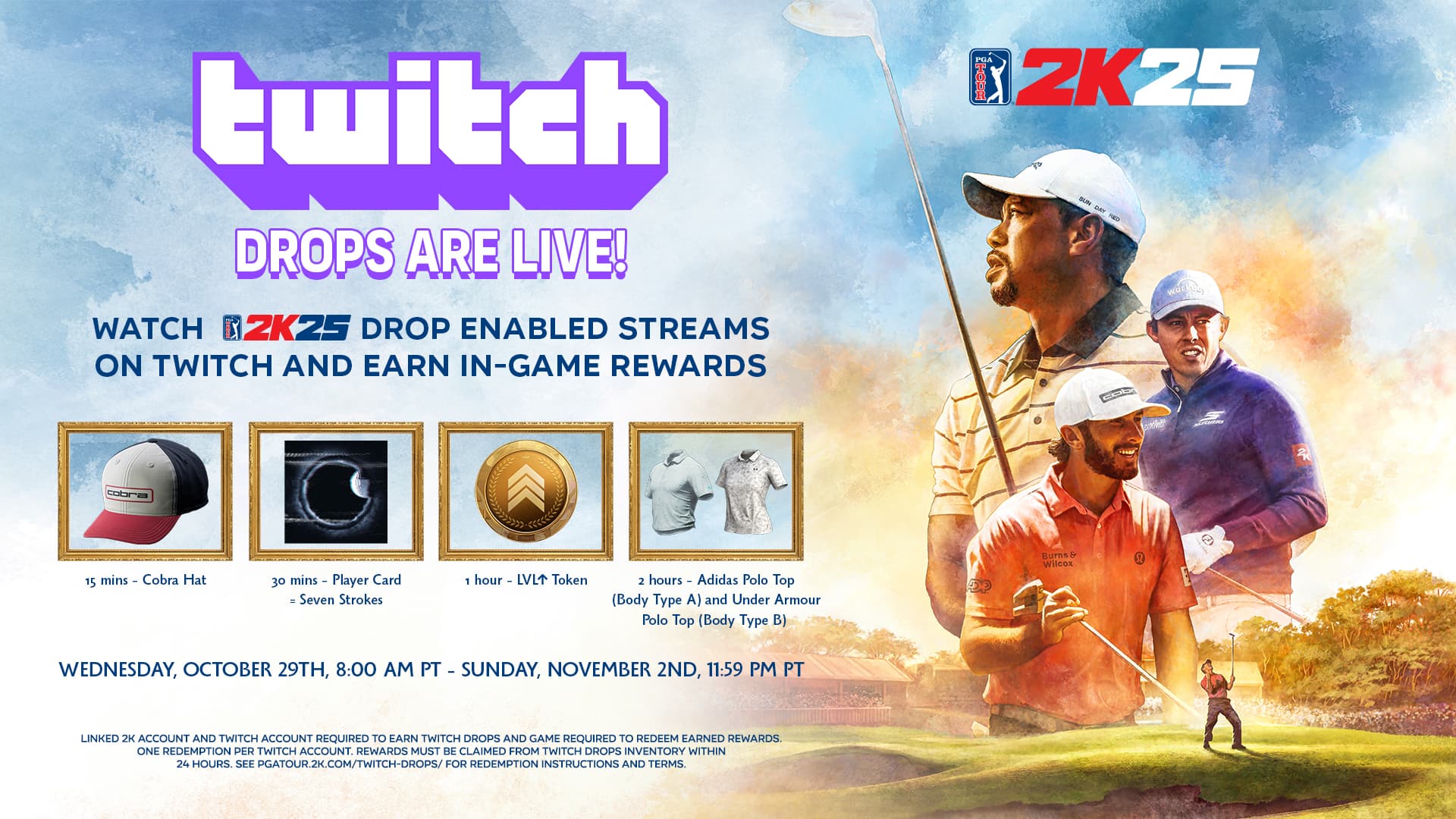 Tune in using your linked Twitch account between Wednesday, October 29th, 8:00 AM PT - Sunday, November 2nd 11:59 PM PT and watch any Twitch Drops enabled live stream of PGA TOUR 2K25 for the amount of time specified in each Drops campaign to earn rewards. You must claim your rewards, in Twitch, within 24 hours!